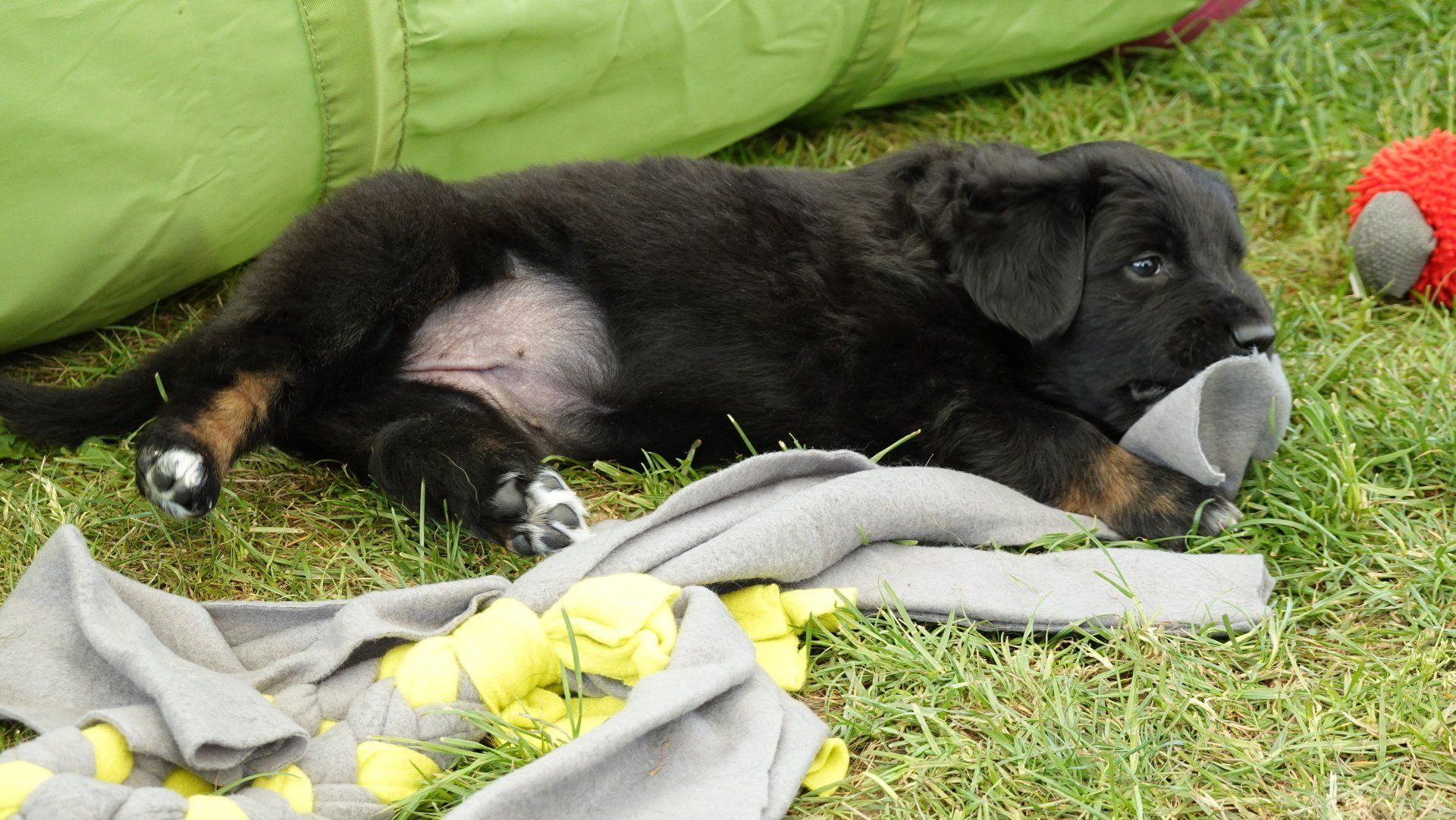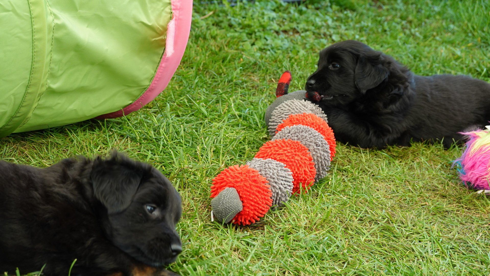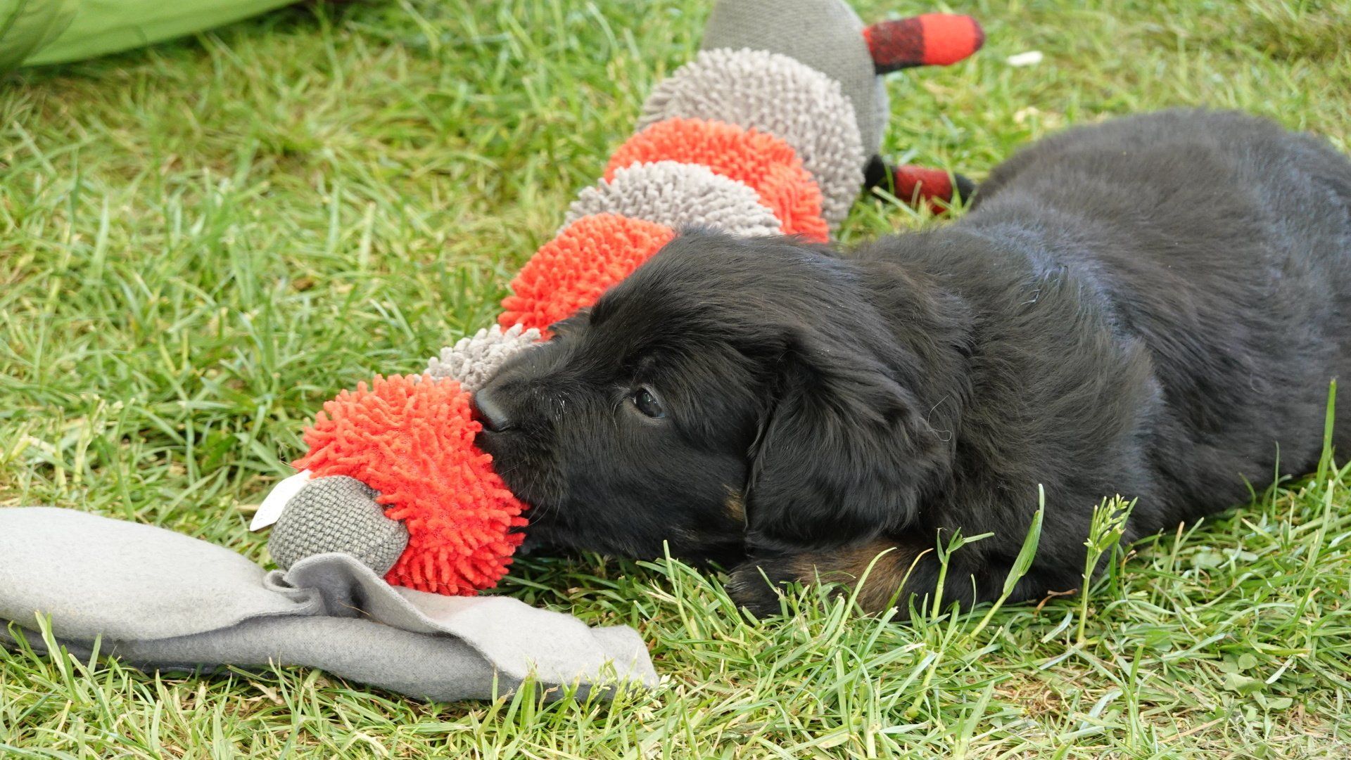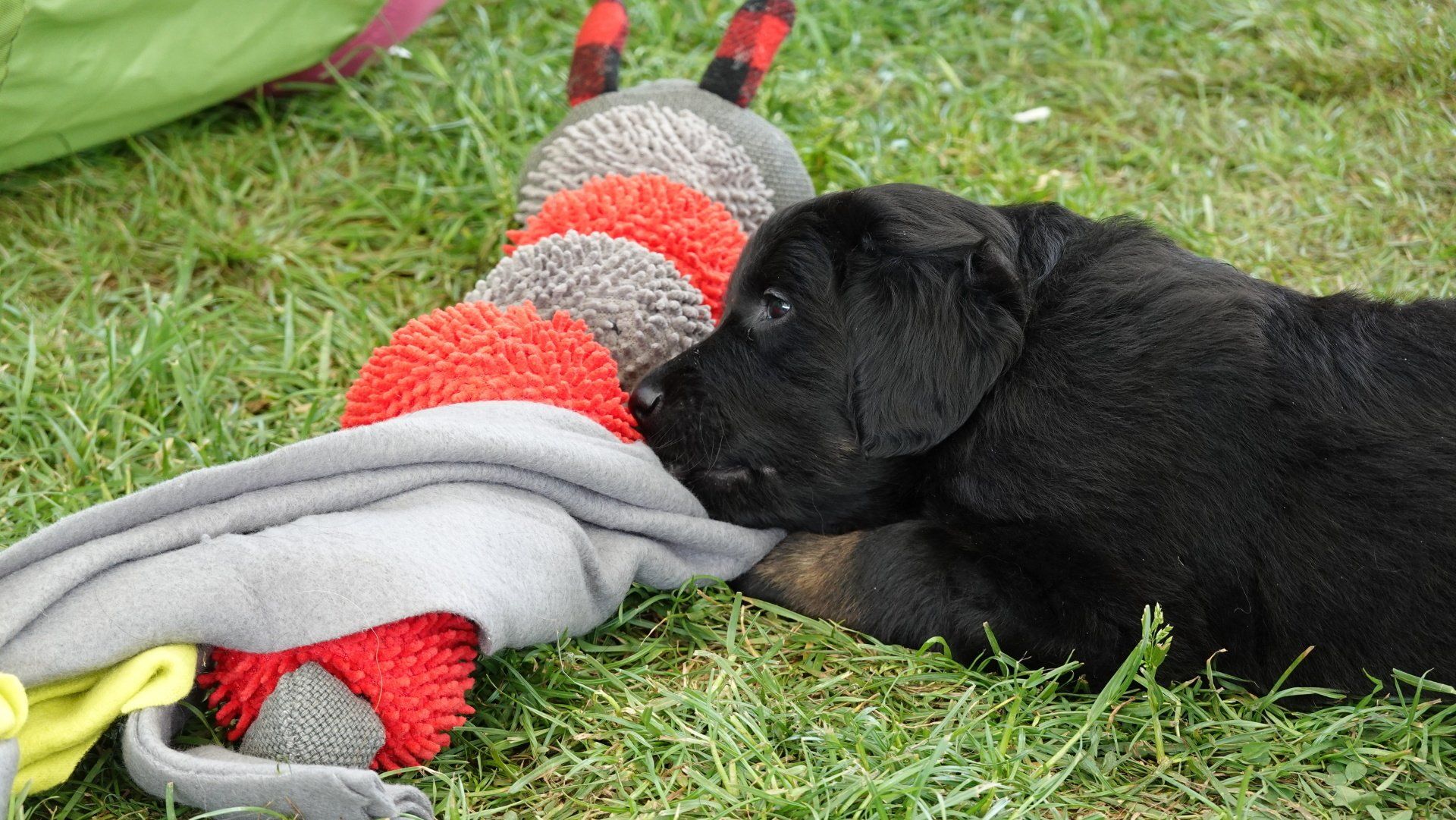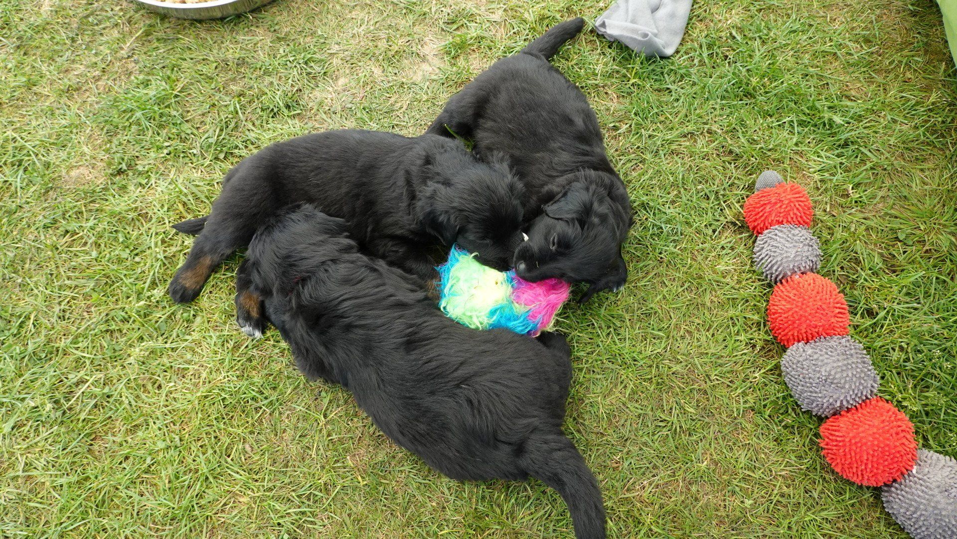 Außerdem hat es ganz viel neues Spielzeug für die Welpen von meiner Freundin Claudia Birke gegeben, die fleißig diverses Zerrspielzeug in mehreren Varianten geflochten hat. Außerdem gab es von ihr noch eine tolle Raupe für den Welpengarten und außerdem jeweils eine niedliche Plüschmaus zum Mitnehmen für die zukünftigen "Welpeneltern". Nicht nur die Welpen sind begeistert, auch Deska versucht immer wieder zu klauen und mit den Dingen im Haus zu verschwinden.
