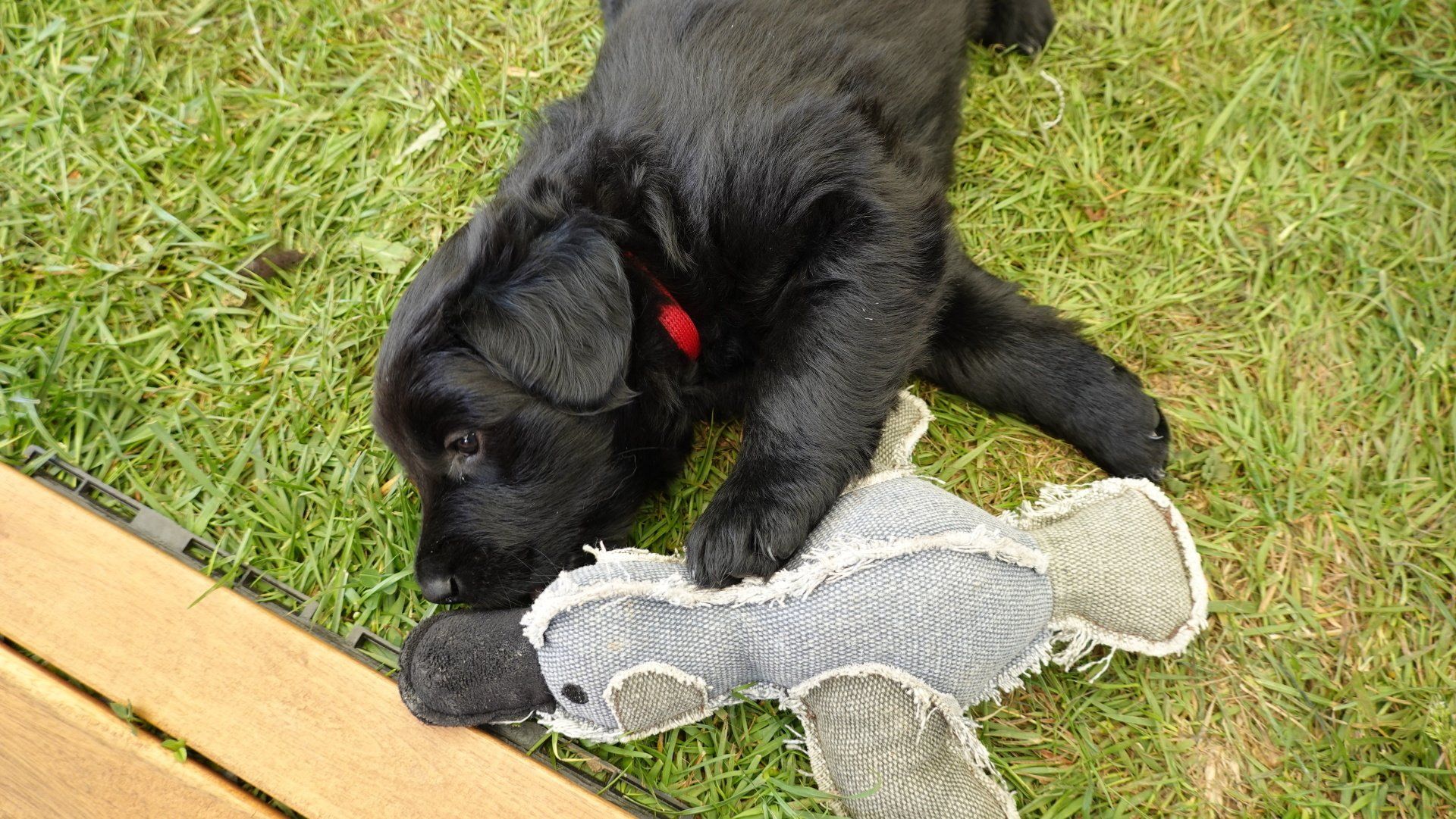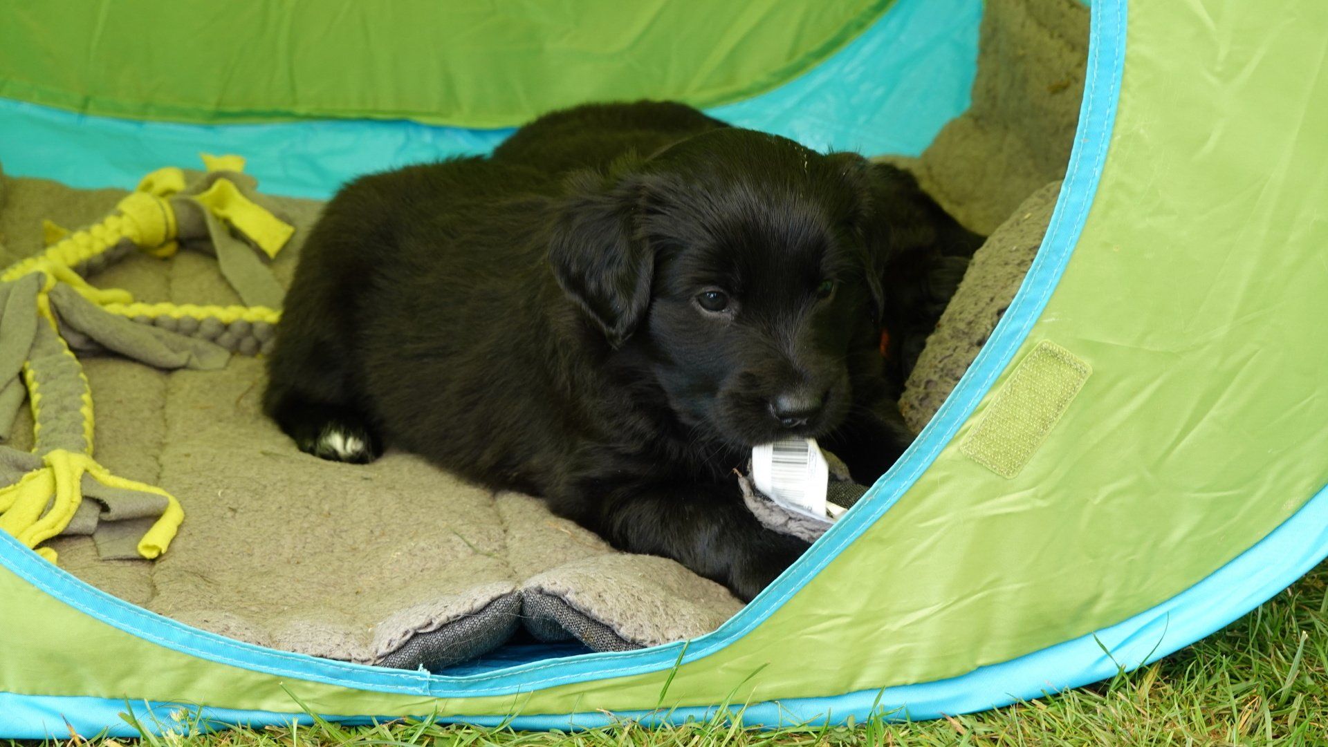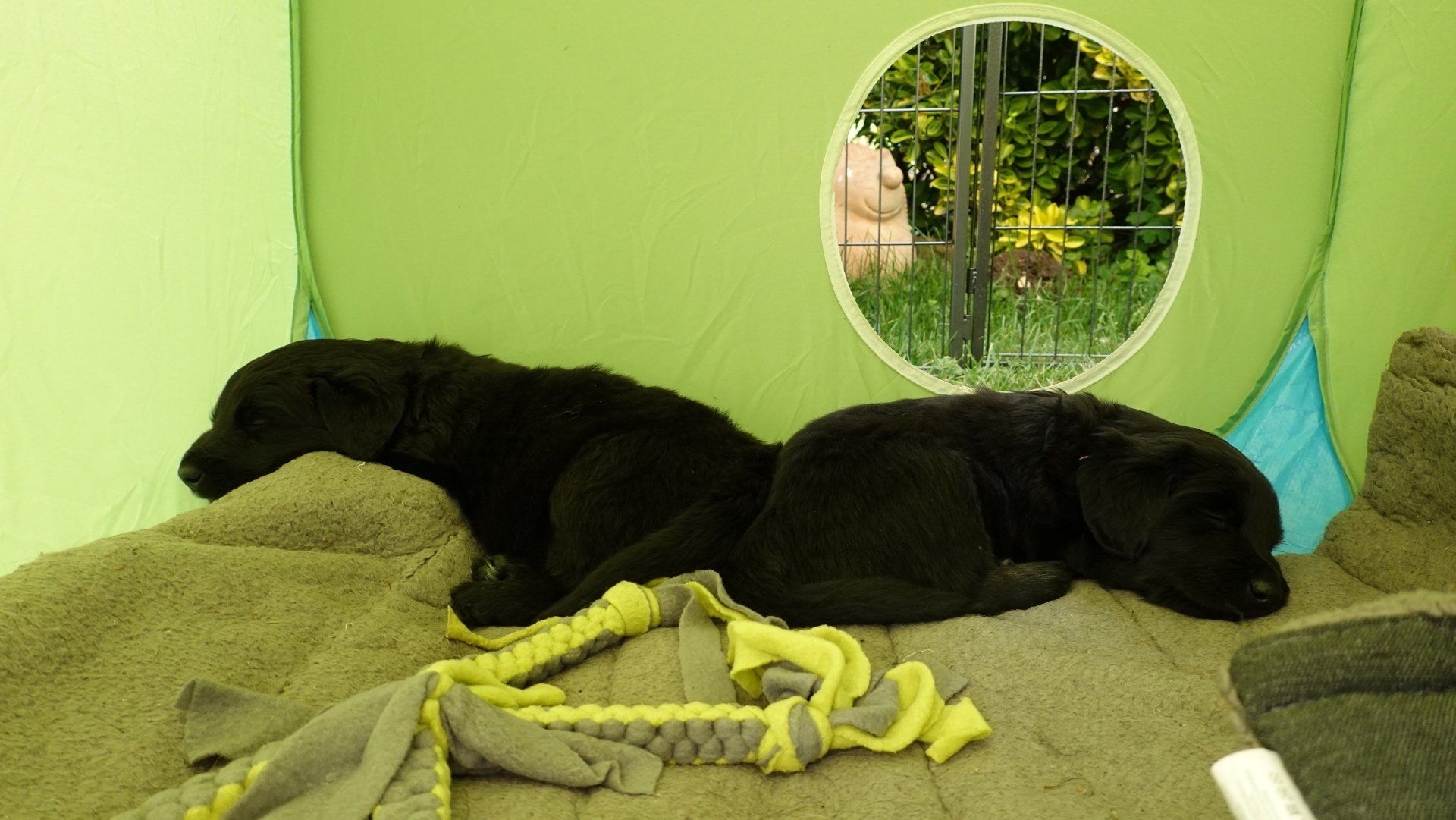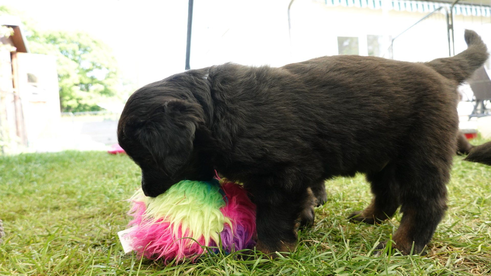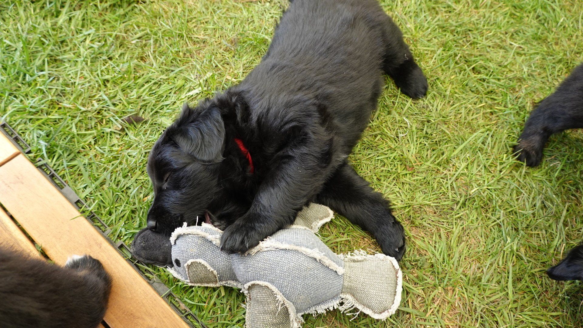 Außerdem hat es ganz viel neues Spielzeug für die Welpen von meiner Freundin Claudia Birke gegeben, die fleißig diverses Zerrspielzeug in mehreren Varianten geflochten hat. Außerdem gab es von ihr noch eine tolle Raupe für den Welpengarten und außerdem jeweils eine niedliche Plüschmaus zum Mitnehmen für die zukünftigen "Welpeneltern". Nicht nur die Welpen sind begeistert, auch Deska versucht immer wieder zu klauen und mit den Dingen im Haus zu verschwinden.