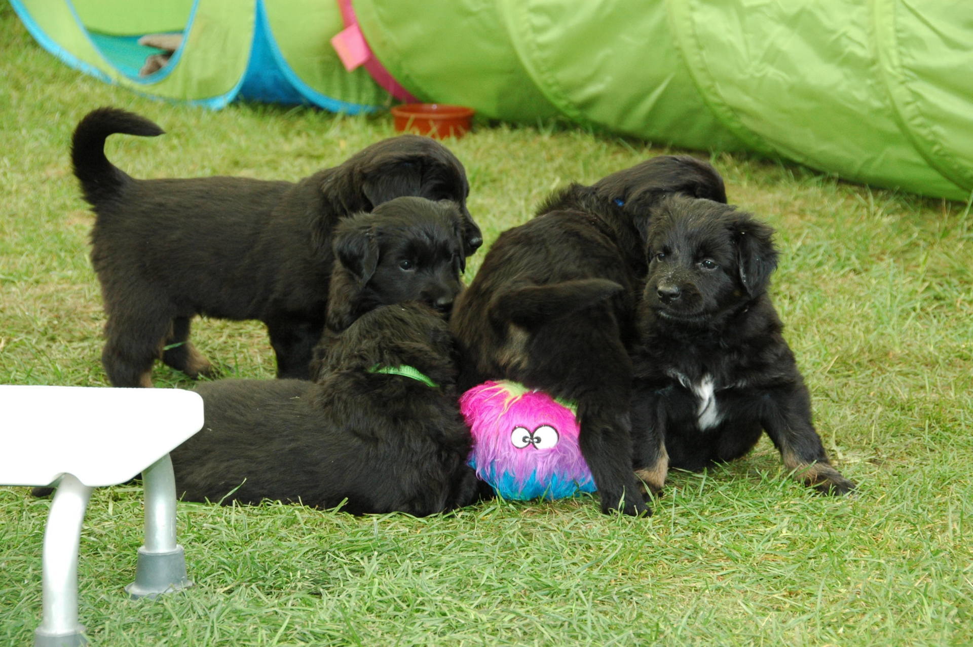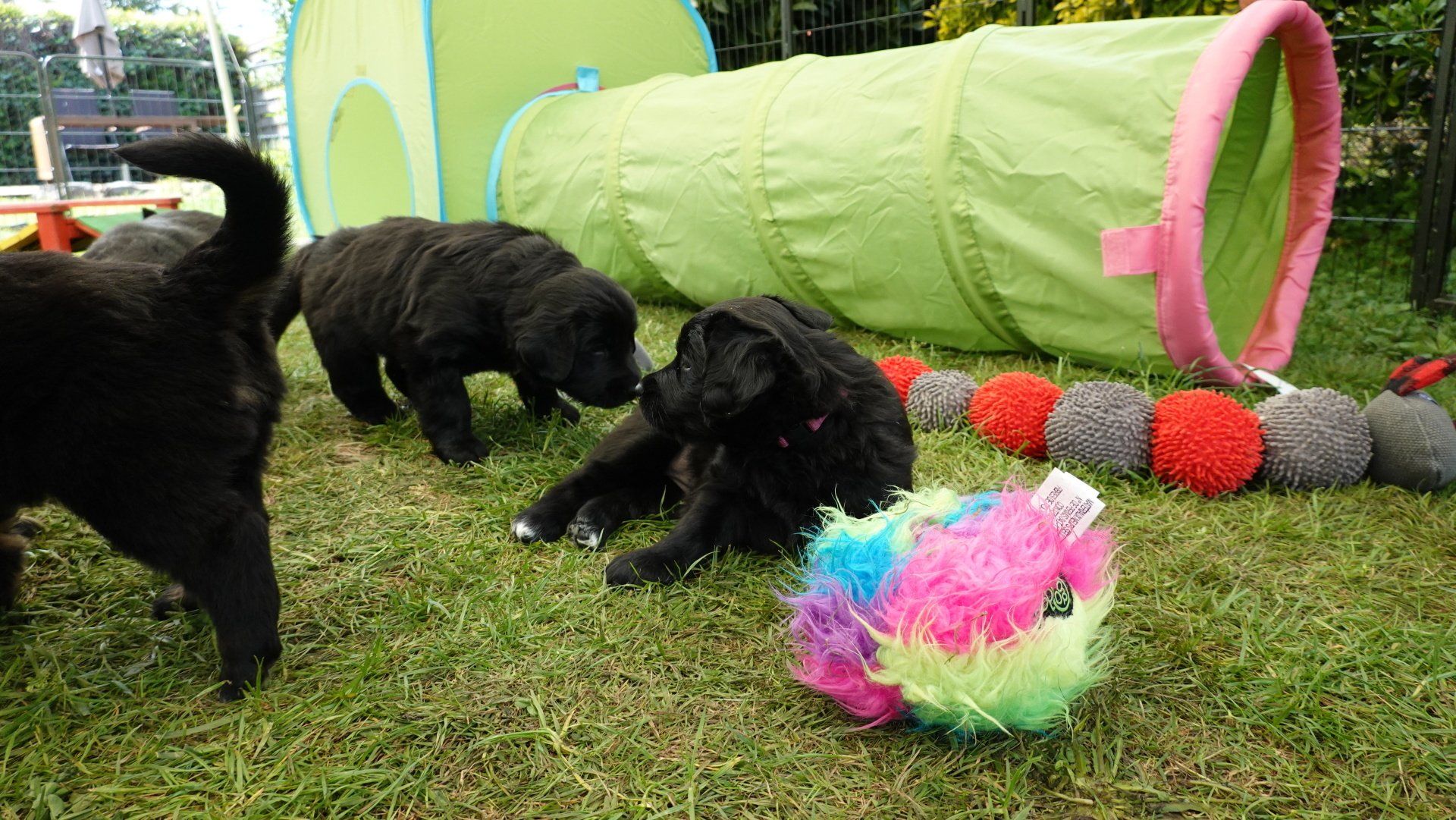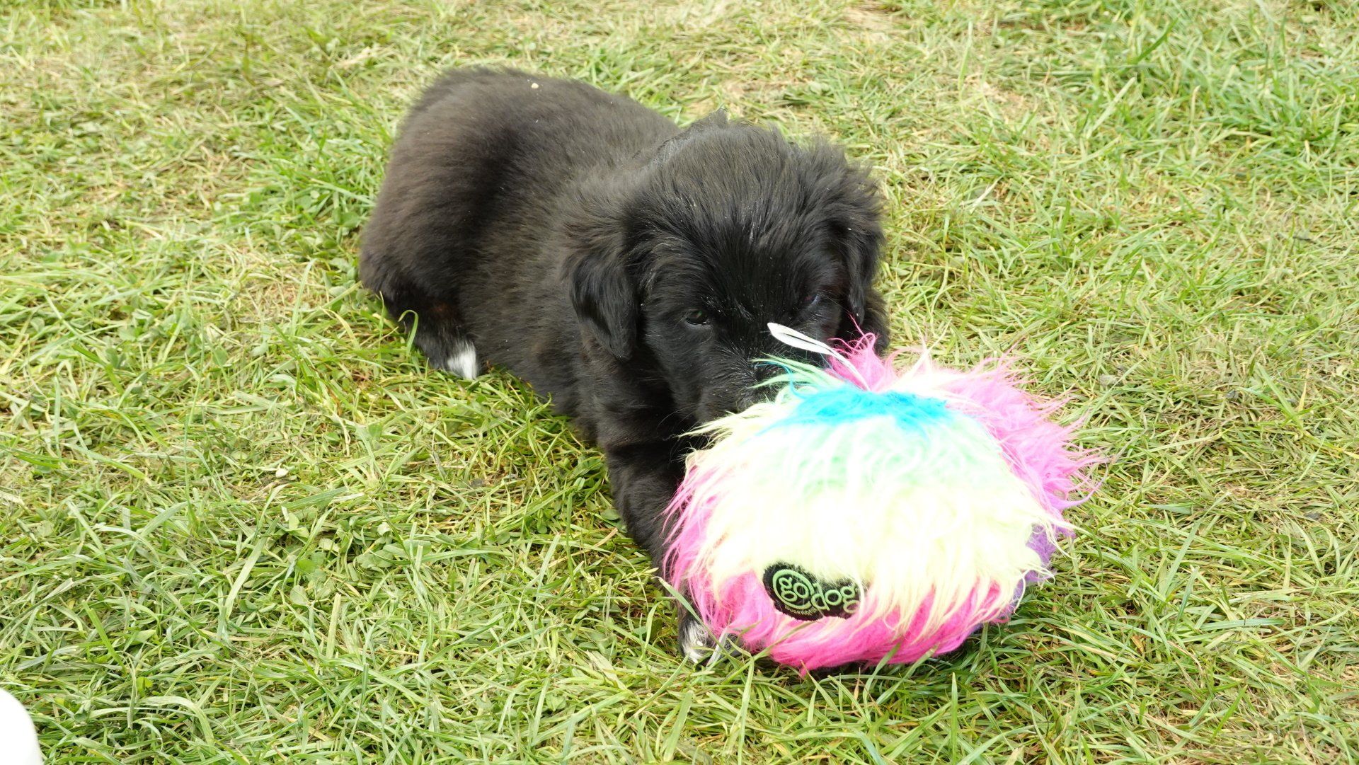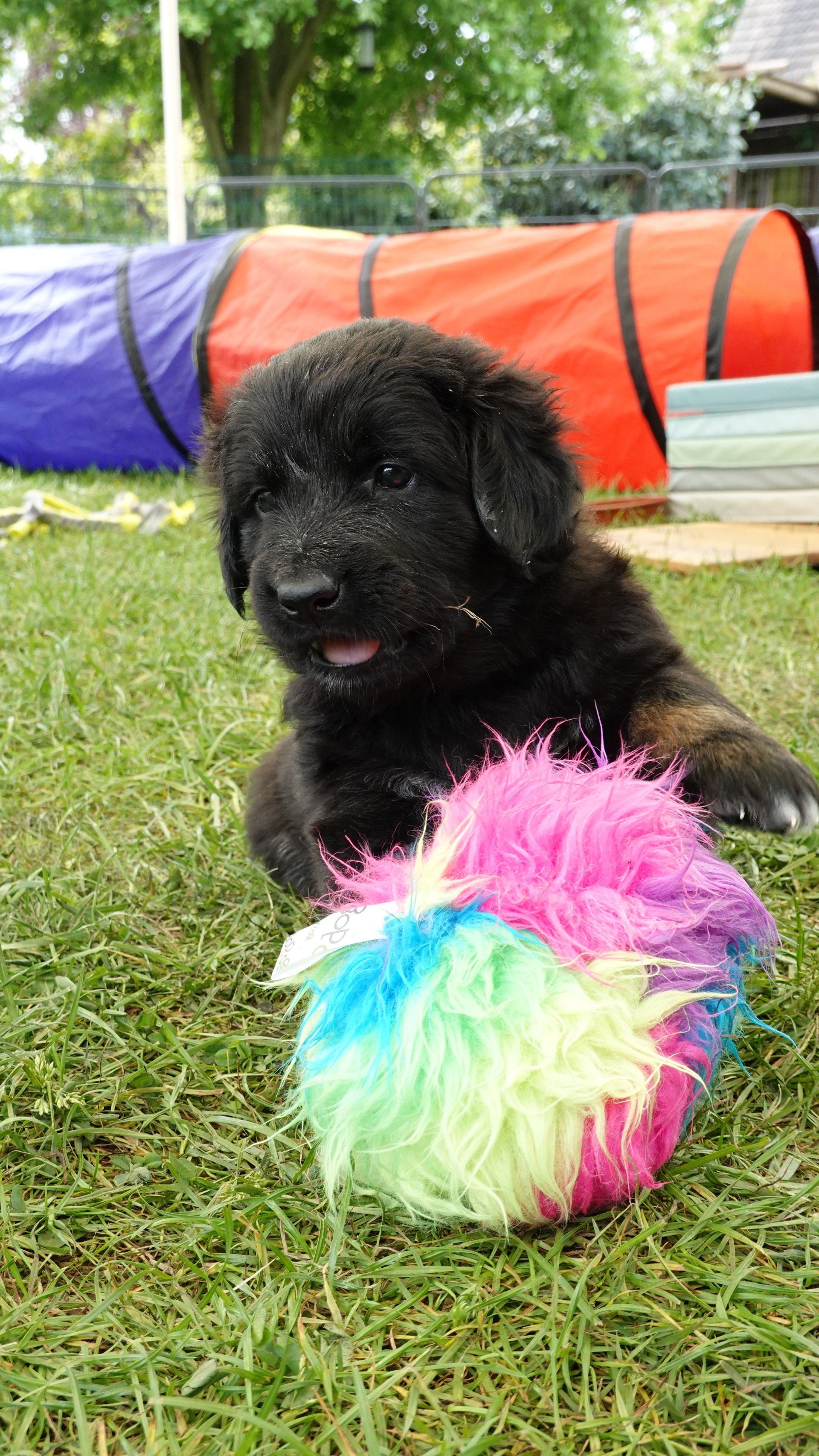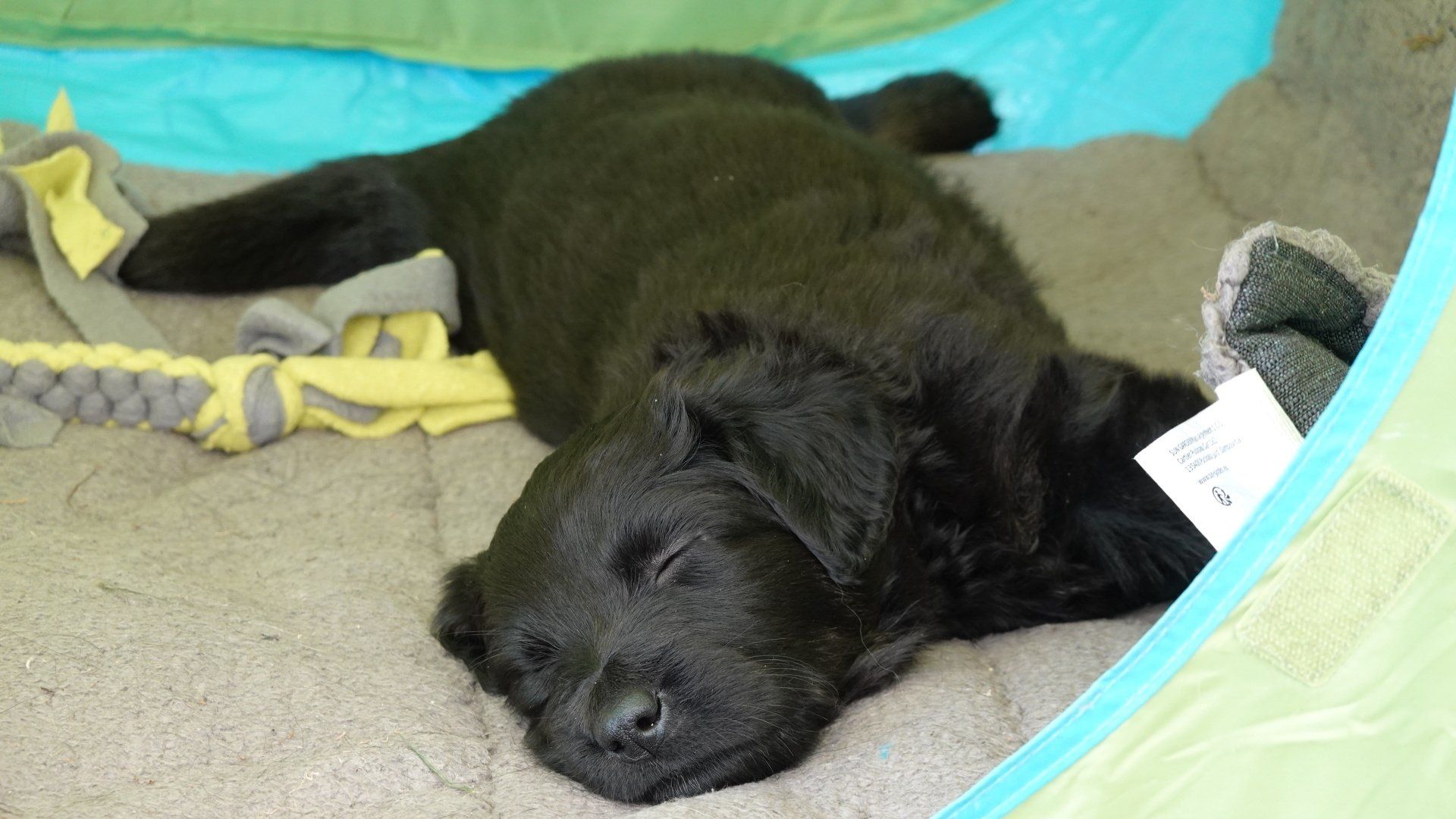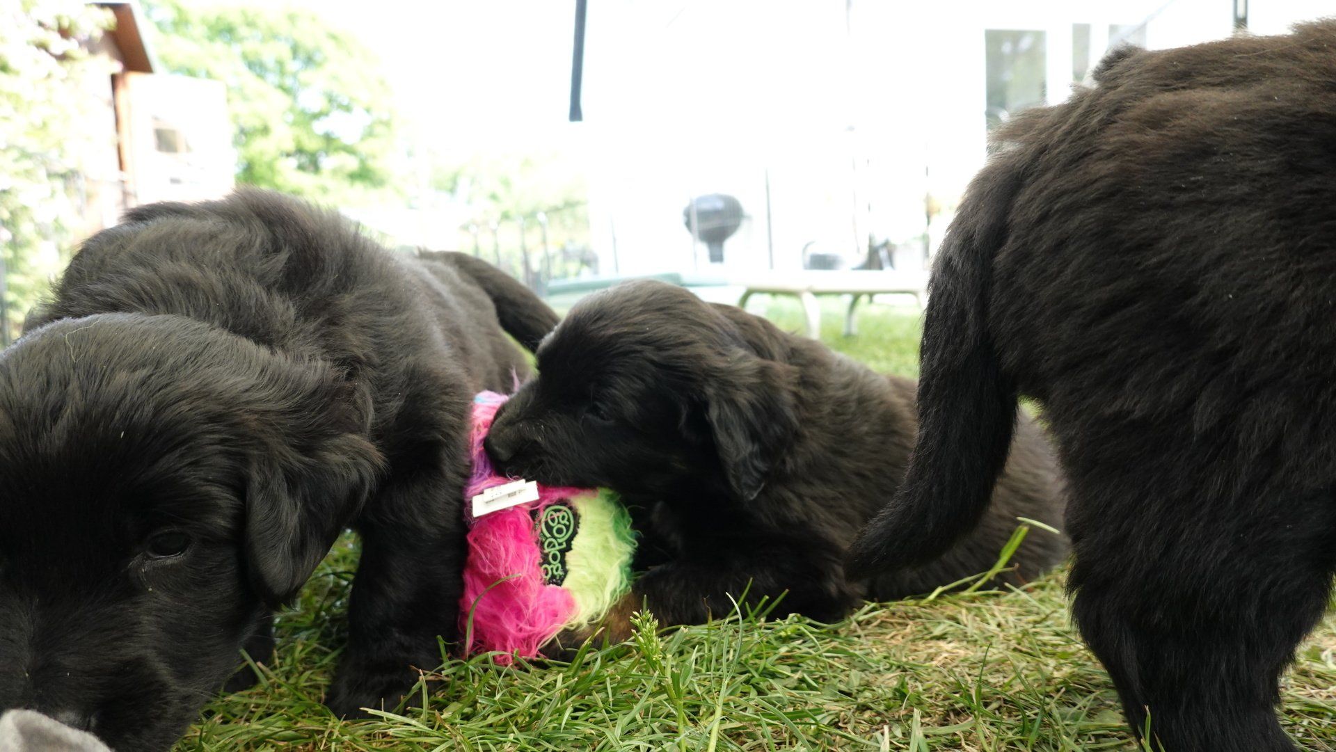 Außerdem hat es ganz viel neues Spielzeug für die Welpen von meiner Freundin Claudia Birke gegeben, die fleißig diverses Zerrspielzeug in mehreren Varianten geflochten hat. Außerdem gab es von ihr noch eine tolle Raupe für den Welpengarten und außerdem jeweils eine niedliche Plüschmaus zum Mitnehmen für die zukünftigen "Welpeneltern". Nicht nur die Welpen sind begeistert, auch Deska versucht immer wieder zu klauen und mit den Dingen im Haus zu verschwinden.