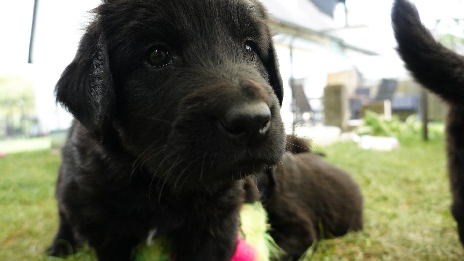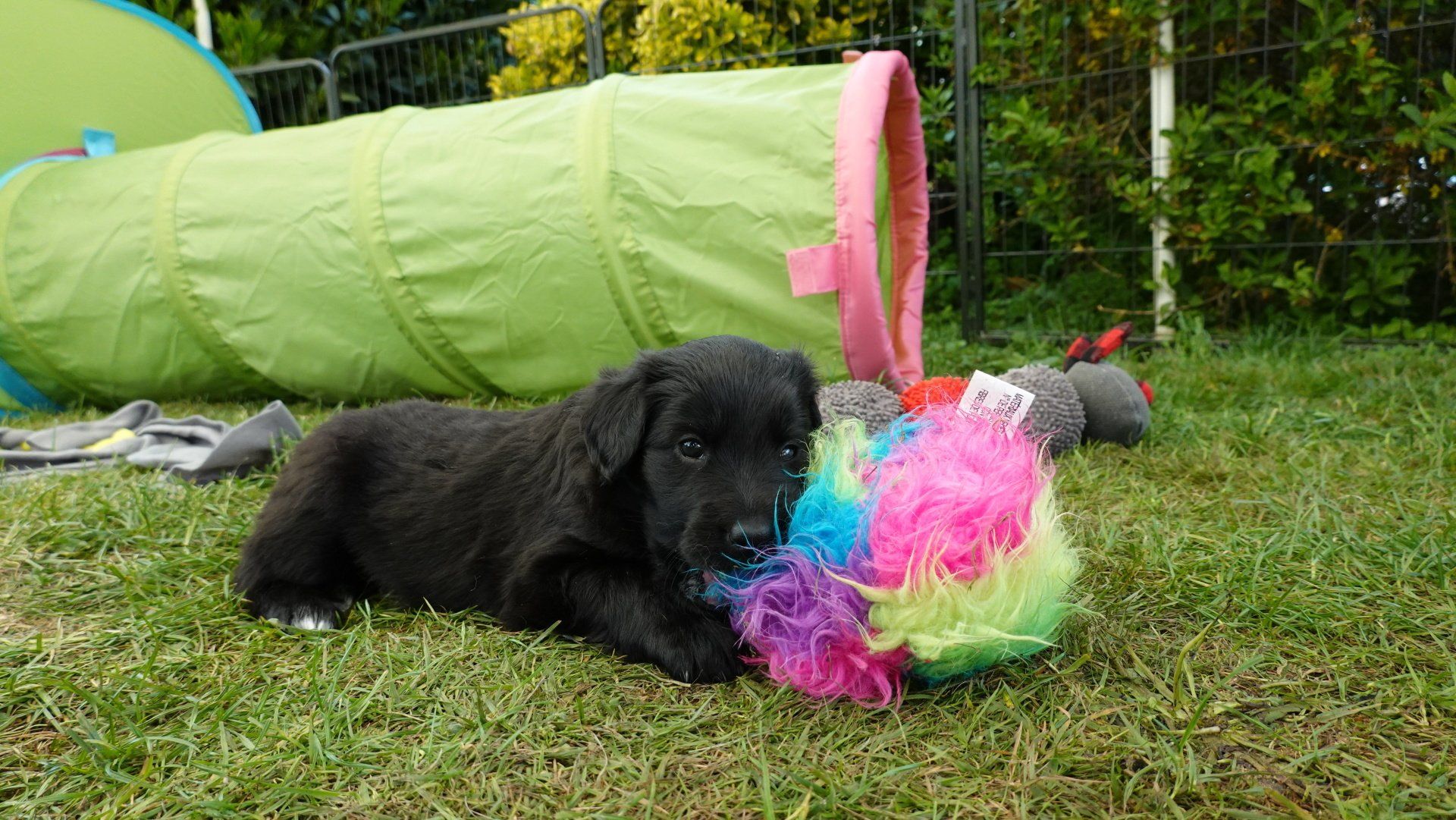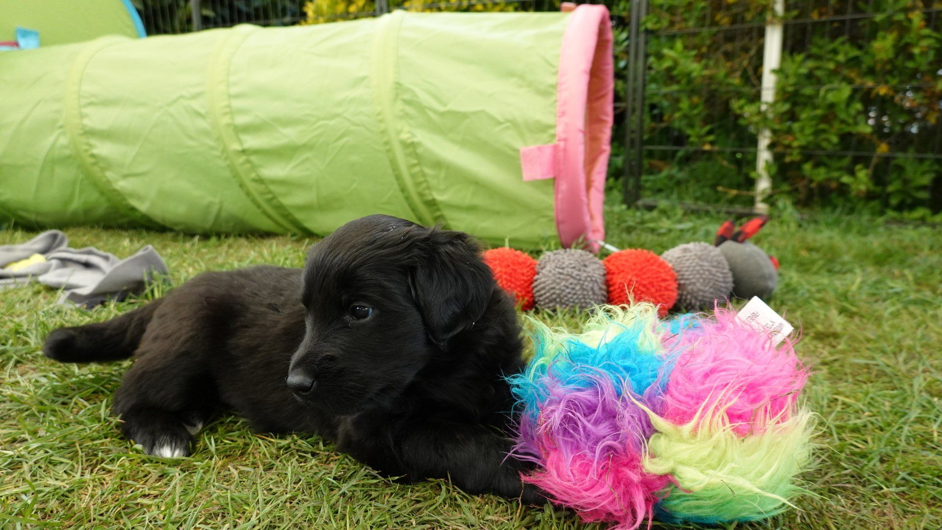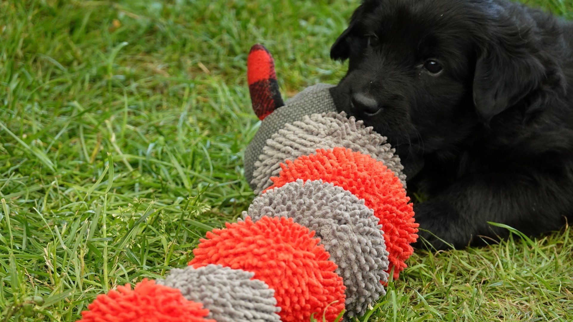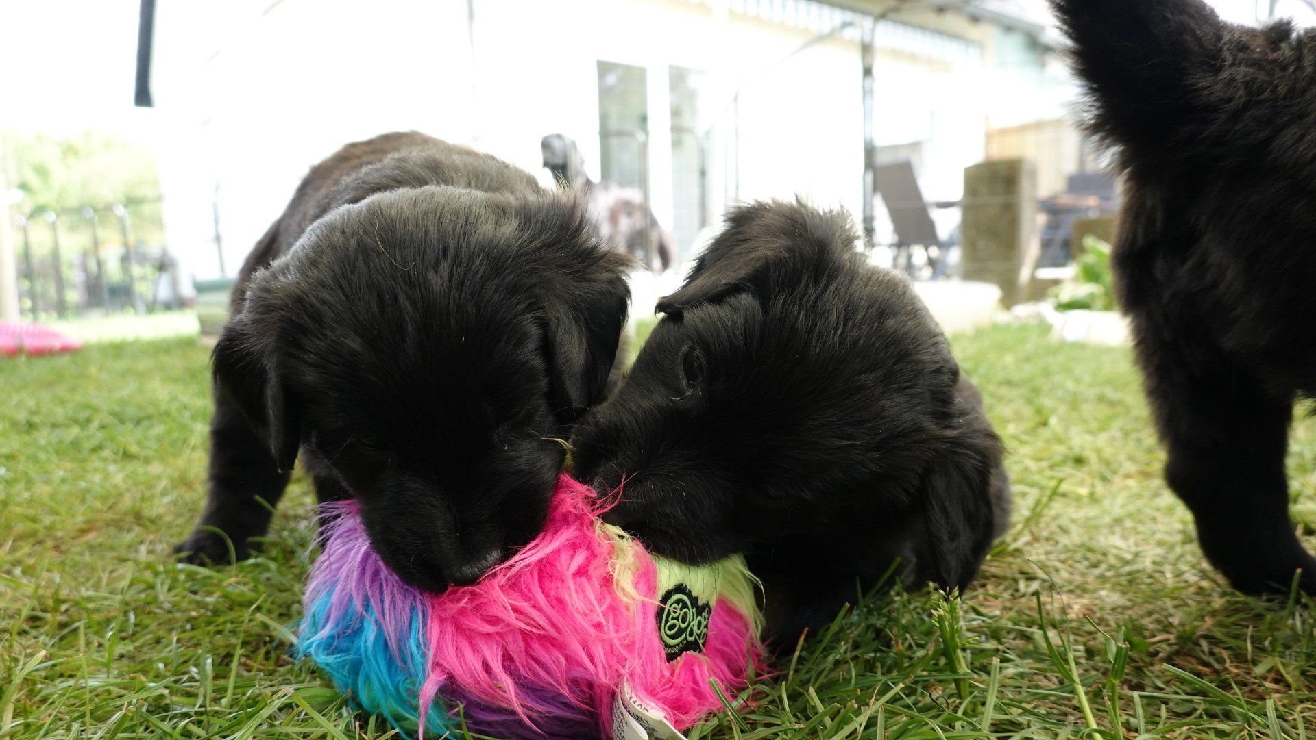 Außerdem hat es ganz viel neues Spielzeug für die Welpen von meiner Freundin Claudia Birke gegeben, die fleißig diverses Zerrspielzeug in mehreren Varianten geflochten hat. Außerdem gab es von ihr noch eine tolle Raupe für den Welpengarten und außerdem jeweils eine niedliche Plüschmaus zum Mitnehmen für die zukünftigen "Welpeneltern". Nicht nur die Welpen sind begeistert, auch Deska versucht immer wieder zu klauen und mit den Dingen im Haus zu verschwinden.