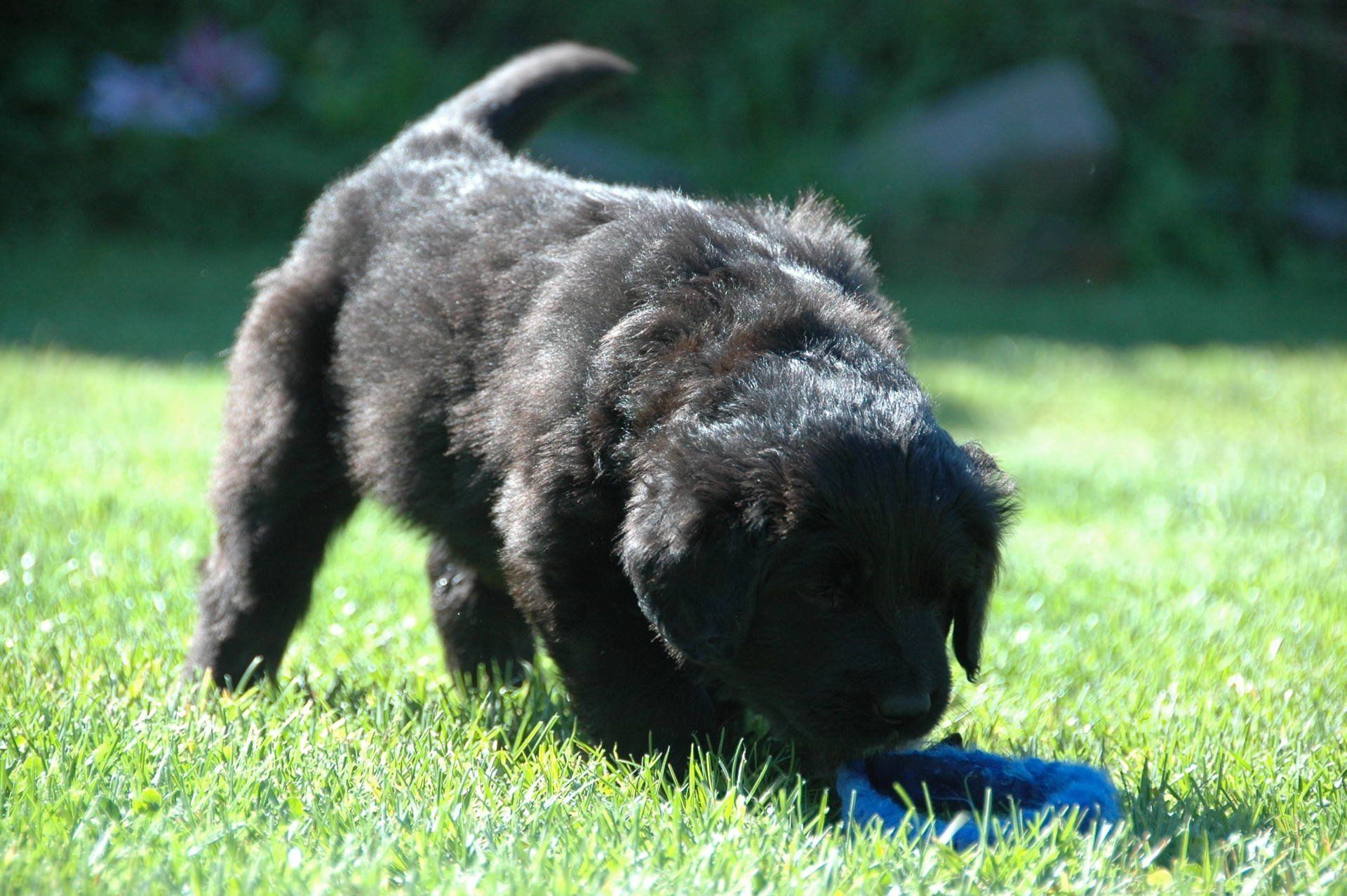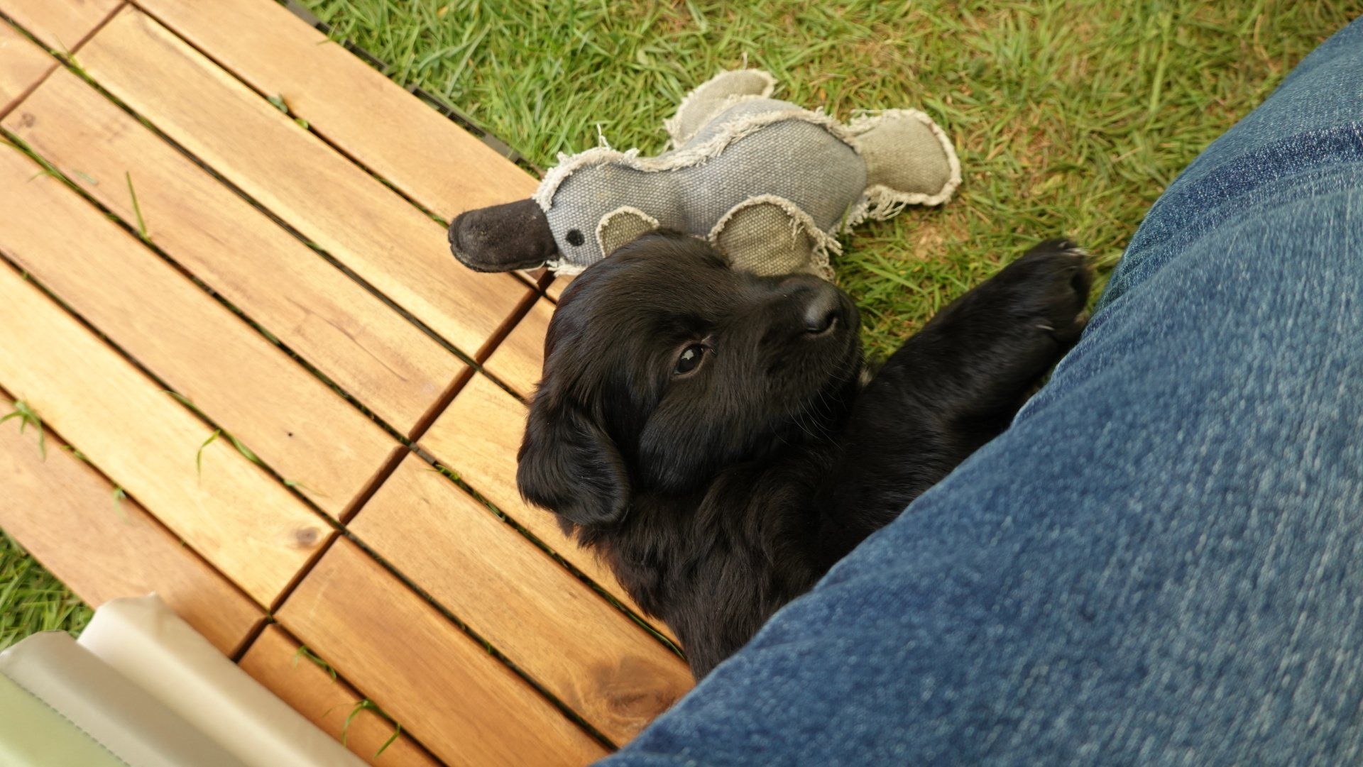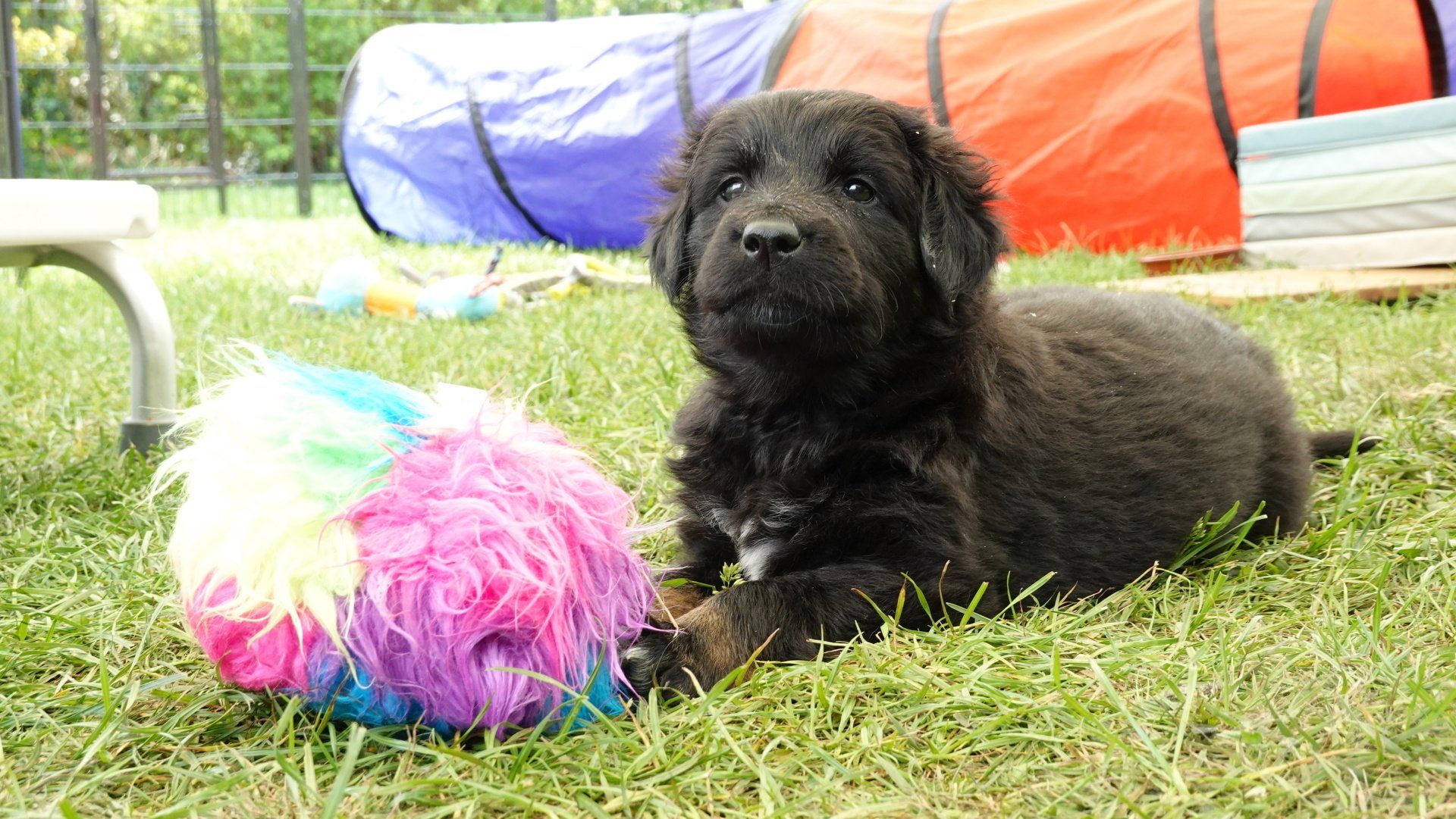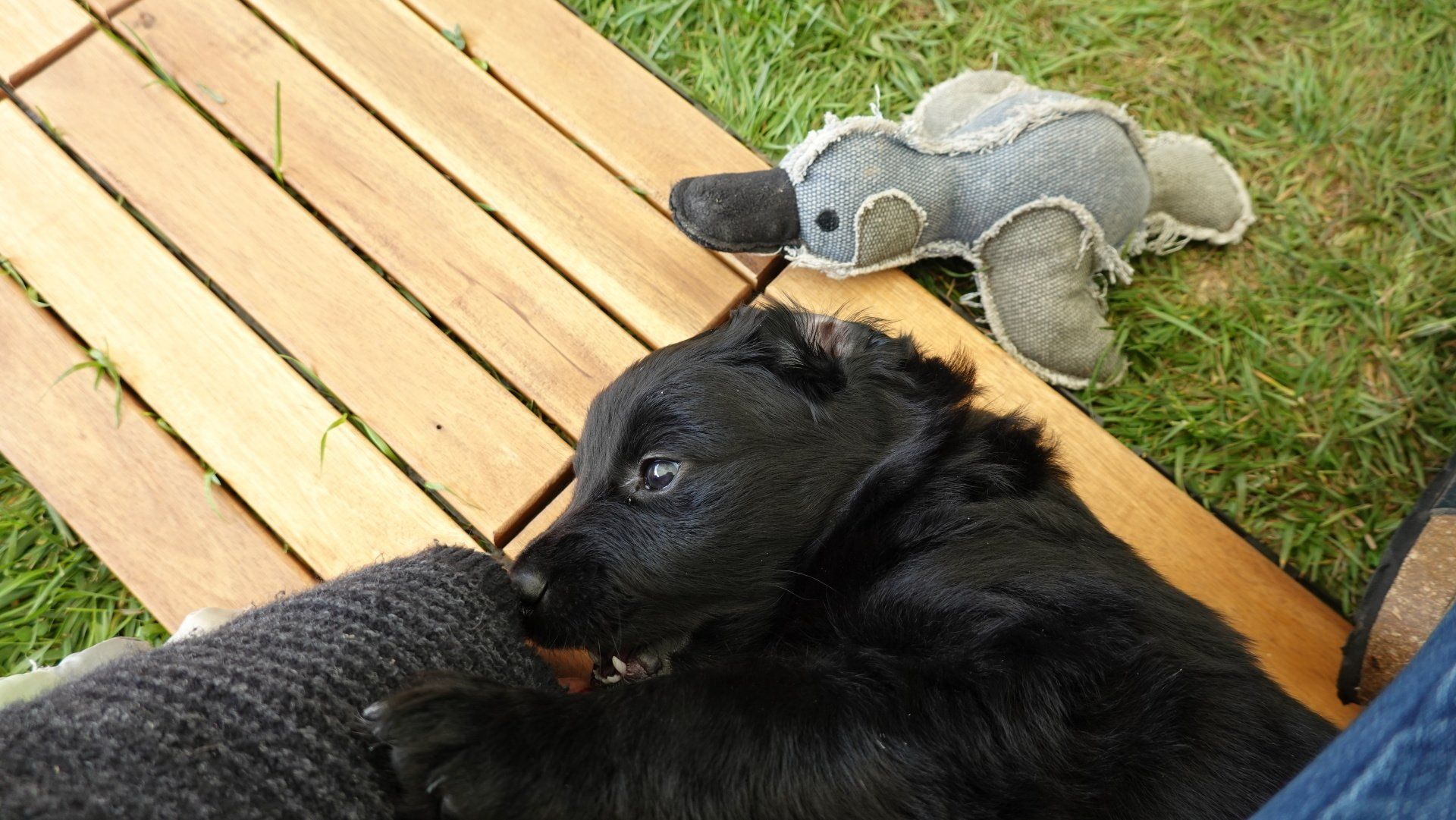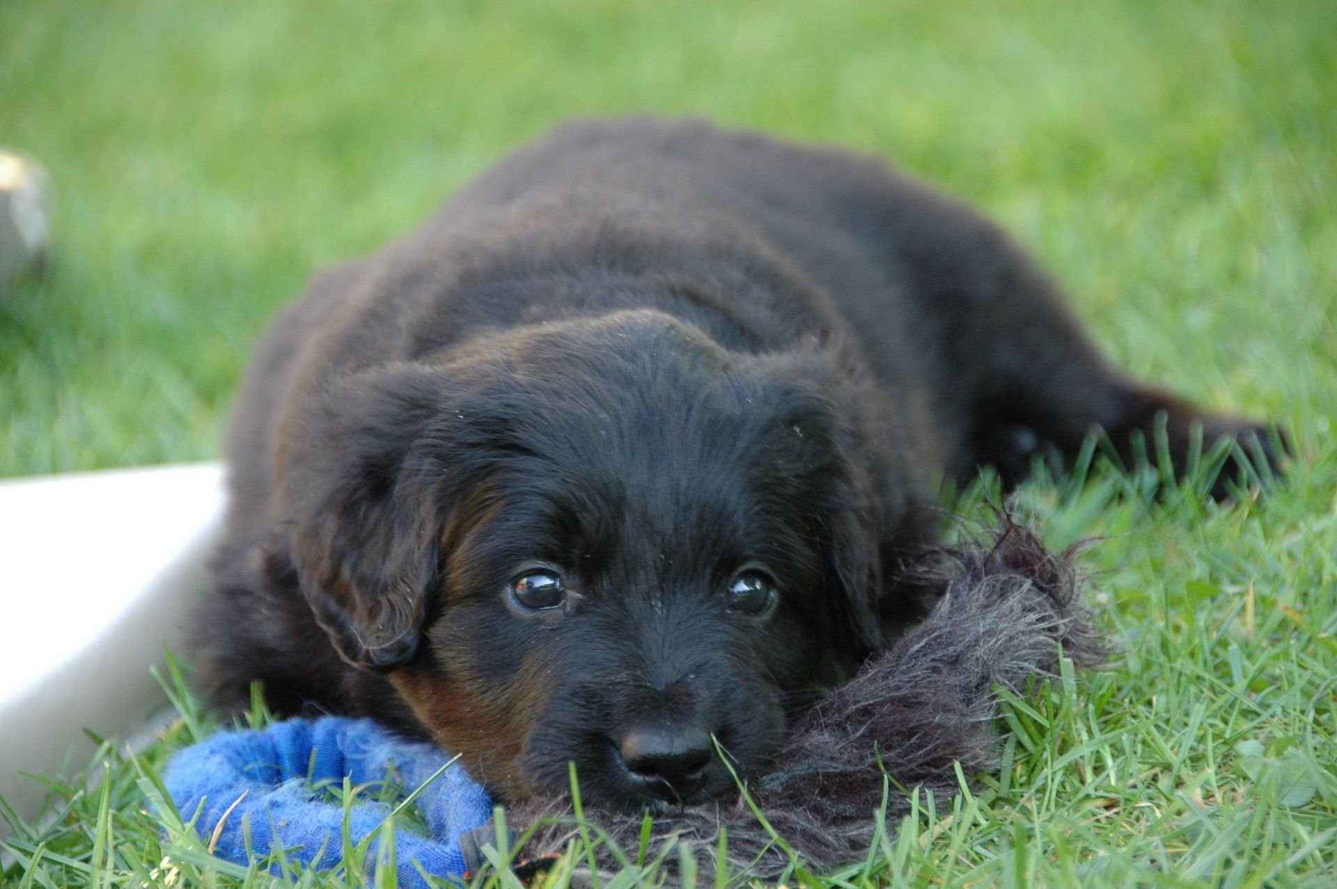 Außerdem hat es ganz viel neues Spielzeug für die Welpen von meiner Freundin Claudia Birke gegeben, die fleißig diverses Zerrspielzeug in mehreren Varianten geflochten hat. Außerdem gab es von ihr noch eine tolle Raupe für den Welpengarten und außerdem jeweils eine niedliche Plüschmaus zum Mitnehmen für die zukünftigen "Welpeneltern". Nicht nur die Welpen sind begeistert, auch Deska versucht immer wieder zu klauen und mit den Dingen im Haus zu verschwinden.